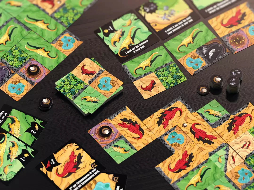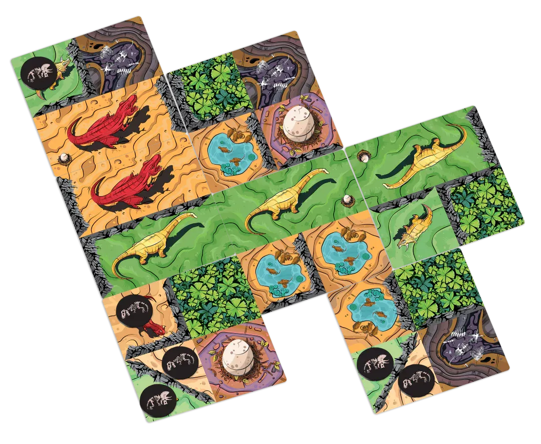 Gameplay involves dual rows of goal tiles and dino tiles, and each turn players select one tile to add to their personal arrangement. Goal tiles stay off to the side for endgame scoring, and dino tiles are arranged in front of each player. Dino tiles include three sizes each of herbivores and carnivores. Each tile must overlap previous ones, either on top of a quarter tile, half tile, or even a whole tile, ensuring that any covered dinos are completely hidden.