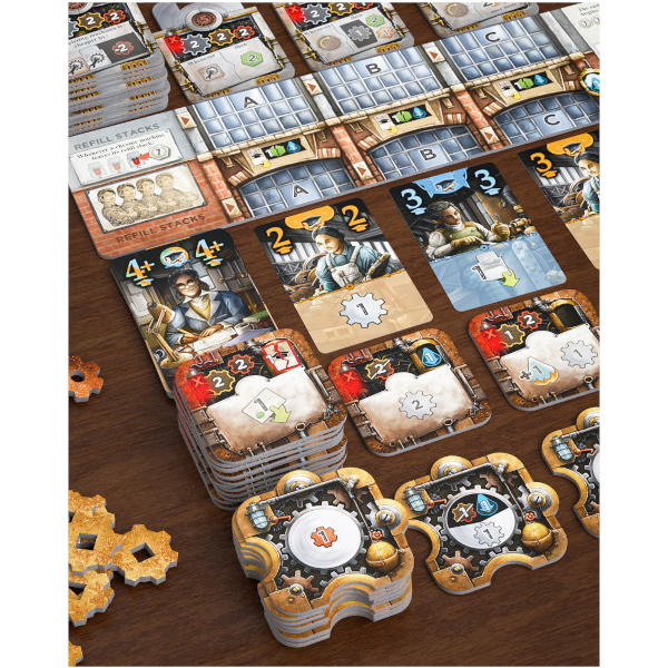 Smiling, you stand in the centre of your factory: the sweet sounds of metal clattering and engines rattling are warming your entrepreneurial heart. Your goal is to build diversified scoring and production engines in order to outrival the other factory owners. However, in the steam-filled air, your biggest enemy is time, because most machines and gears rust away quickly. So you are well-advised to also produce rustproof chrome gears and invest in powerful chrome machines.