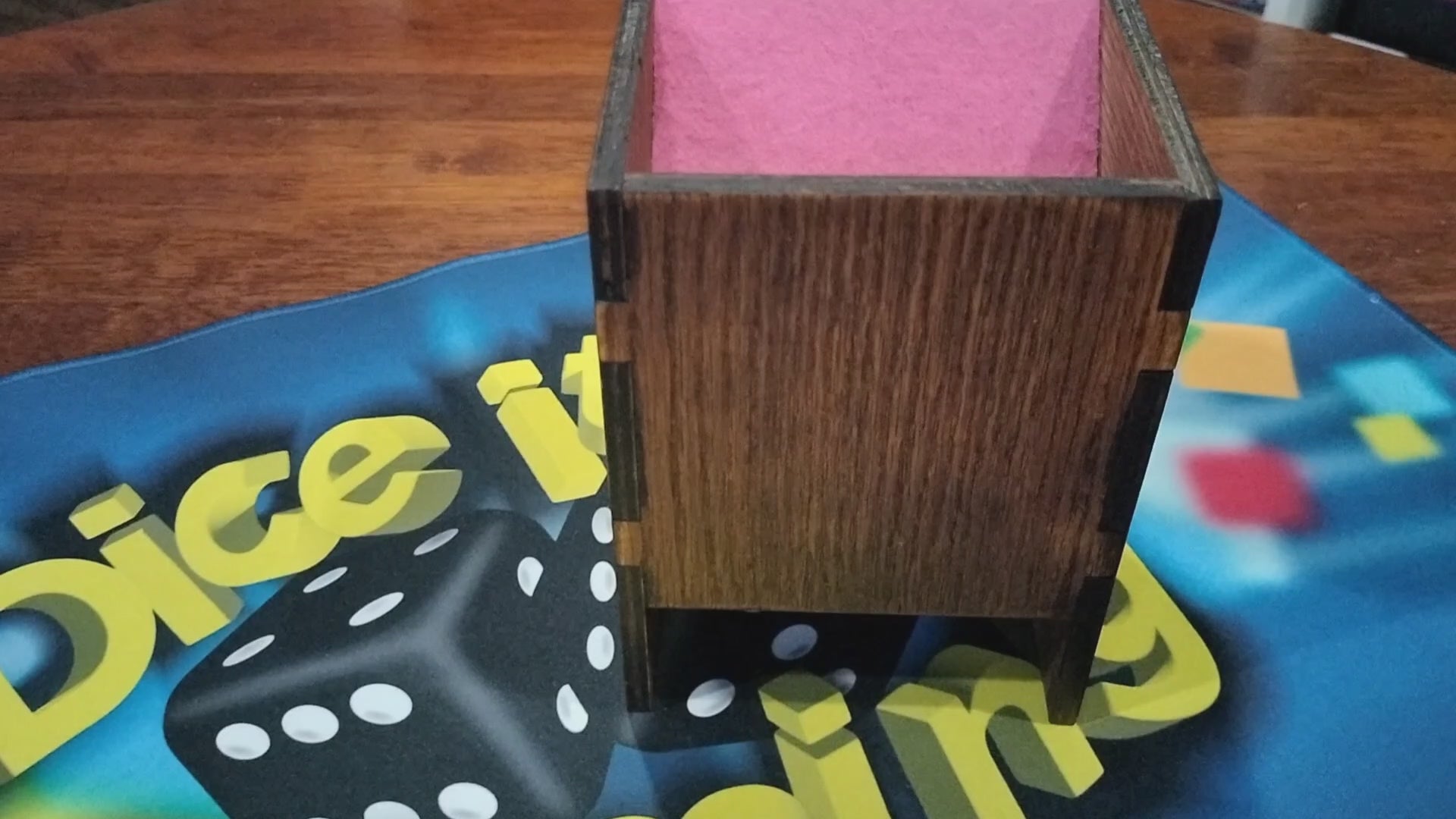 This dice tower is made from Red Oak ply board, stained and has a matt varnish on it to protect it.